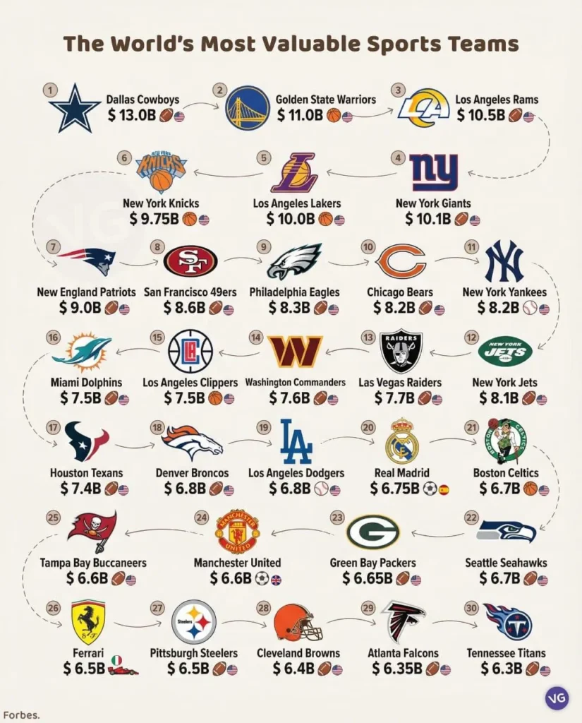 1位 Dallas Cowboys(アメリカンフットボール)ー $13.0B