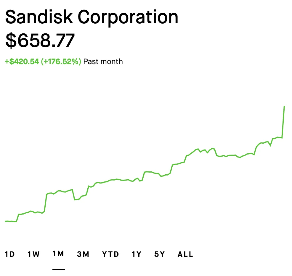 AIデータセンター用のSSD需要がエグいからな。その最大手がサンディスクなんだから、この株価も納得だ。