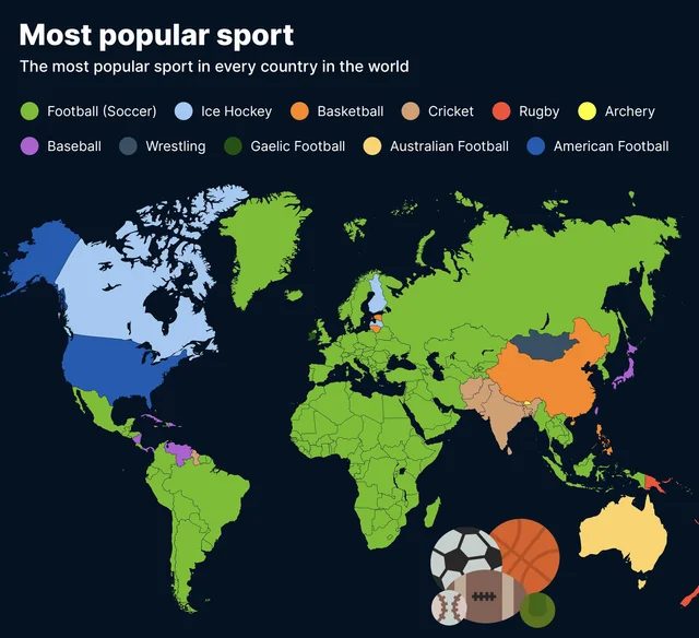 面白いのは、この地図だとラグビーは全部ひとまとめにされてることだな。ラグビーがトップの国はニュージーランド以外だとパプアニューギニアしかないけど、あそこは間違いなくユニオンじゃなくてリーグだしな。