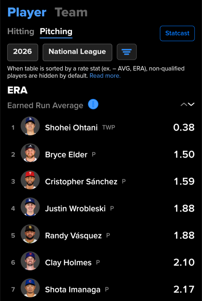 ナ・リーグ1位のアルカンタラからは32%遅れてるけど、あいつは開幕5試合で完投した2人のうちの1人だからな。他の防御率リーダーたちとも20%差があるけど、大谷は登板が1回少ない。