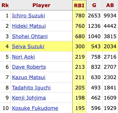 イチローはキャリアのほとんどが1番打者だったから、打点が少ないのは驚かない。けど、誠也がメジャーの短い期間でこれだけやってるのは素直に凄いと思うわ。
